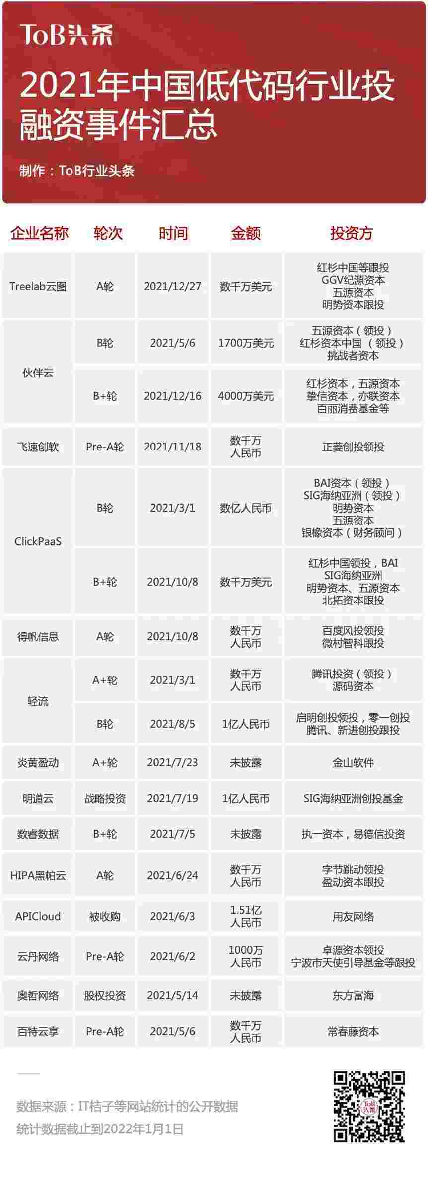 到2021年,,,,,无/低代码投融资规模势头更甚,,,,,,,,,,,,其中包括轻流两轮融资(A+轮数千万人民币,,,,,,B轮近亿人民币)、、、、、、、、、、、VIVO钱包 两轮融资(B轮数亿人民币,,,,,,,,,,,,,,,B+轮数千万美元)、、、、、、、、、百特云享数千万元Pre-A轮融资......